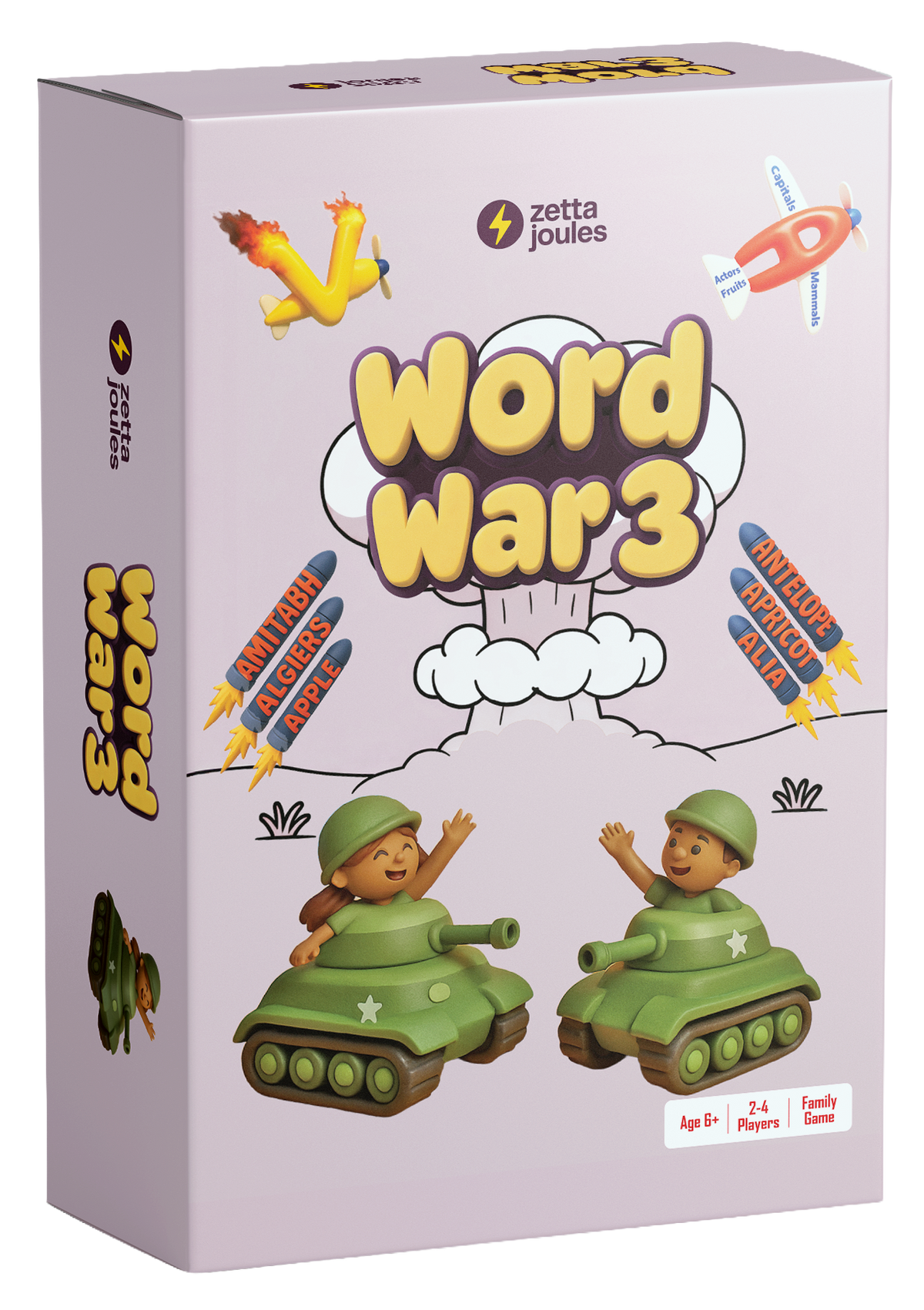 With subcategories, scoring twists, and brain-boosting challenges, this is more than just a word game — it’s a full-on thinking adventure! Perfect for ages 6+, Word War 3 rewards quick minds, wild imaginations, and bold guesses. Ready to play smart and score big? Let the war of words begin!